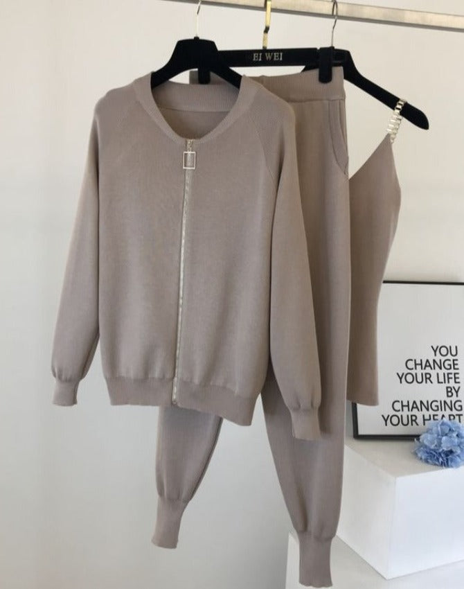 LAILA SET: Pants with pockets, knitted zippered bomber, top with chain